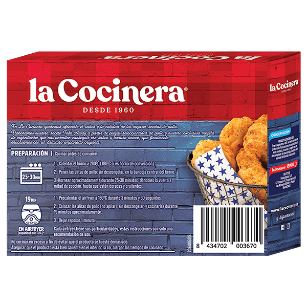 Prueba las nuevas alitas de pollo estilo americano de La Cocinera. Marinadas con un rebozado especiado super crujiente, las alitas de pollo estilo americano serán el plato estrella para compartir con familiares y amigos, pon el horno a calentar y ¡a disfrutar!
