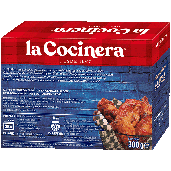Alitas de pollo (86%), azúcar moreno, azúcar, almidón, especias, vinagre de vino en polvo, azúcar caramelizada, sal ahumada, tomate en polvo, miel en polvo, sal, extracto de levadura, regulador de acidez (ácido cítrico), extractos de especias, aroma natural. Puede contener cereales que contengan gluten, apio, huevo, mostaza, soja.