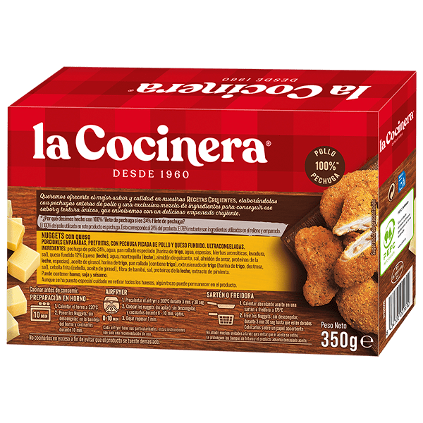 Pechuga de pollo 24%, agua, pan rallado especiado (harina de trigo, agua, especias, hierbas aromáticas, levadura, sal),queso fundido 12% (queso, agua, mantequilla, almidón de guisante, sal, almidón de arroz, proteínas de la leche, especias), aceite de girasol, harina de trigo, pan rallado (contiene trigo), extrusionado de trigo (harina de trigo, dextrosa, sal), cebolla frita (cebolla, aceite de girasol), fibra de bambú, sal, proteínas de la leche, extracto de pimienta.