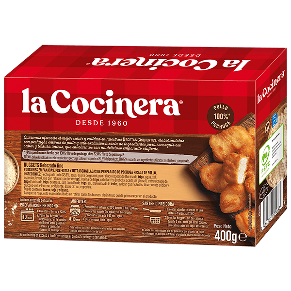 Pechuga de pollo 32,8%, agua, aceite de girasol, pan rallado especiado (harina de trigo, agua, sal, especias, levadura), pan rallado (contiene trigo), harina de trigo, cebolla frita (cebolla, aceite de girasol), extrusionado de trigo (harina de trigo, dextrosa, sal), almidón de trigo, sal, proteínas de la leche, azúcar, gasificantes: bicarbonato sódico y glucono-delta-lactona, acidulante: ácido cítrico, especias.